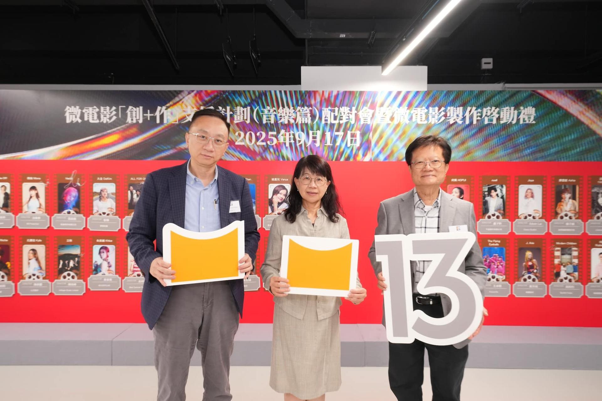 《第十三屆微電影「創+作」支援計劃(音樂篇)》微電影製作配對會暨啓動禮於9月17日舉行,我們非常榮幸邀請到署理文創產業專員曹黎淑霞女士(圖中)擔任啓動禮的主禮嘉賓,聯同香港互動市務商會會長方保僑先生(圖左)及IFPI國際唱片業協會(香港會)總裁馮添枝先生,BBS(圖右)為今屆「支援計劃」揭開序幕,配對會上亦揭曉32隊團隊名單。