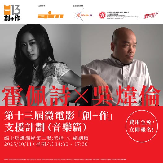 由香港互動市務商會舉辦、文創產業發展處為主要贊助機構的《微電影「創+作」支援計劃(音樂篇)》(「支援計劃」),已正式踏入第十三屆!支援計劃為所有參與的製作團隊,提供製作資金、專業指導和全面的培訓。培訓內容涵蓋編劇、導演、製作及後期製作等範疇,務求令每部在「支援計劃」下所製作的微電影更精益求精。另一方面,亦鼓勵更多歌手參與幕前演出,推動香港創意產業邁向更多元、更豐富的新里程。