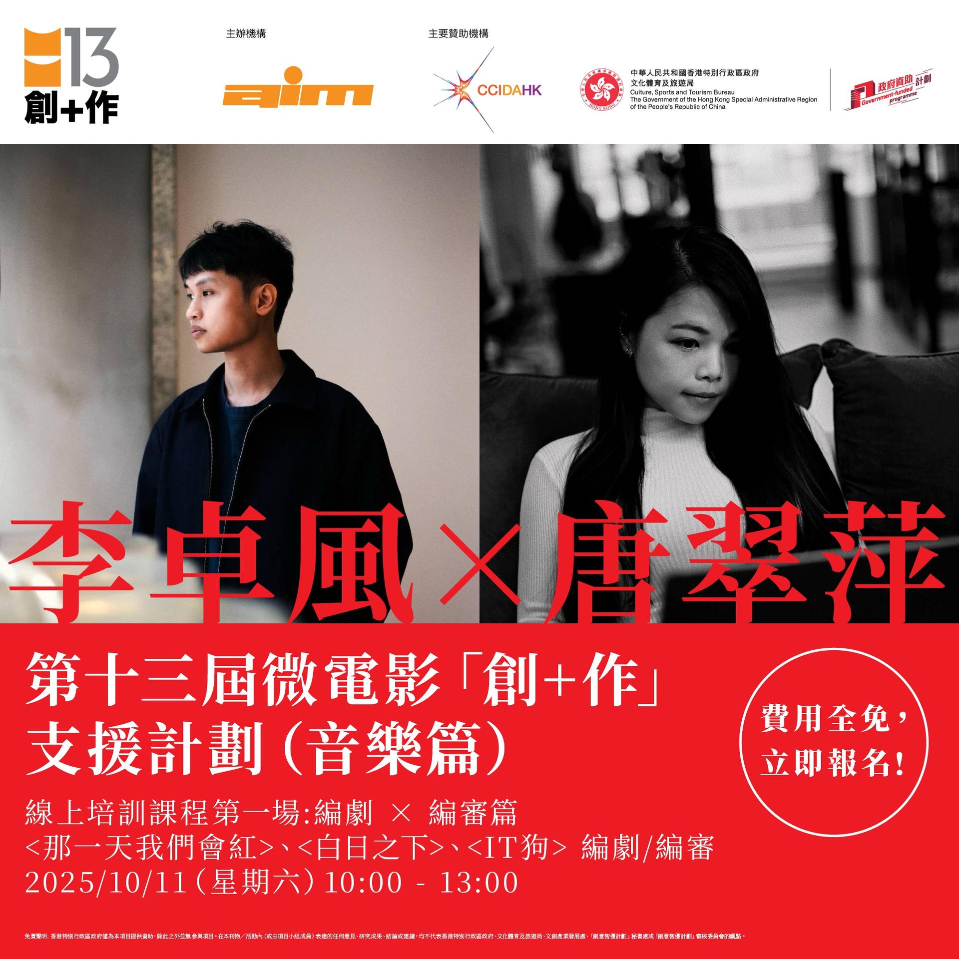 第十三屆微電影「創+作」支援計劃(音樂篇)即將舉行線上培訓課程,第一場線上培訓課程會以故事的靈魂:從文字到銀幕的編劇藝術為主題。編劇/編審 李卓風 × 唐翠萍 將於線上大師班深度對談,帶你走進編劇思維,探索 如何讓劇本真正「活起來」。