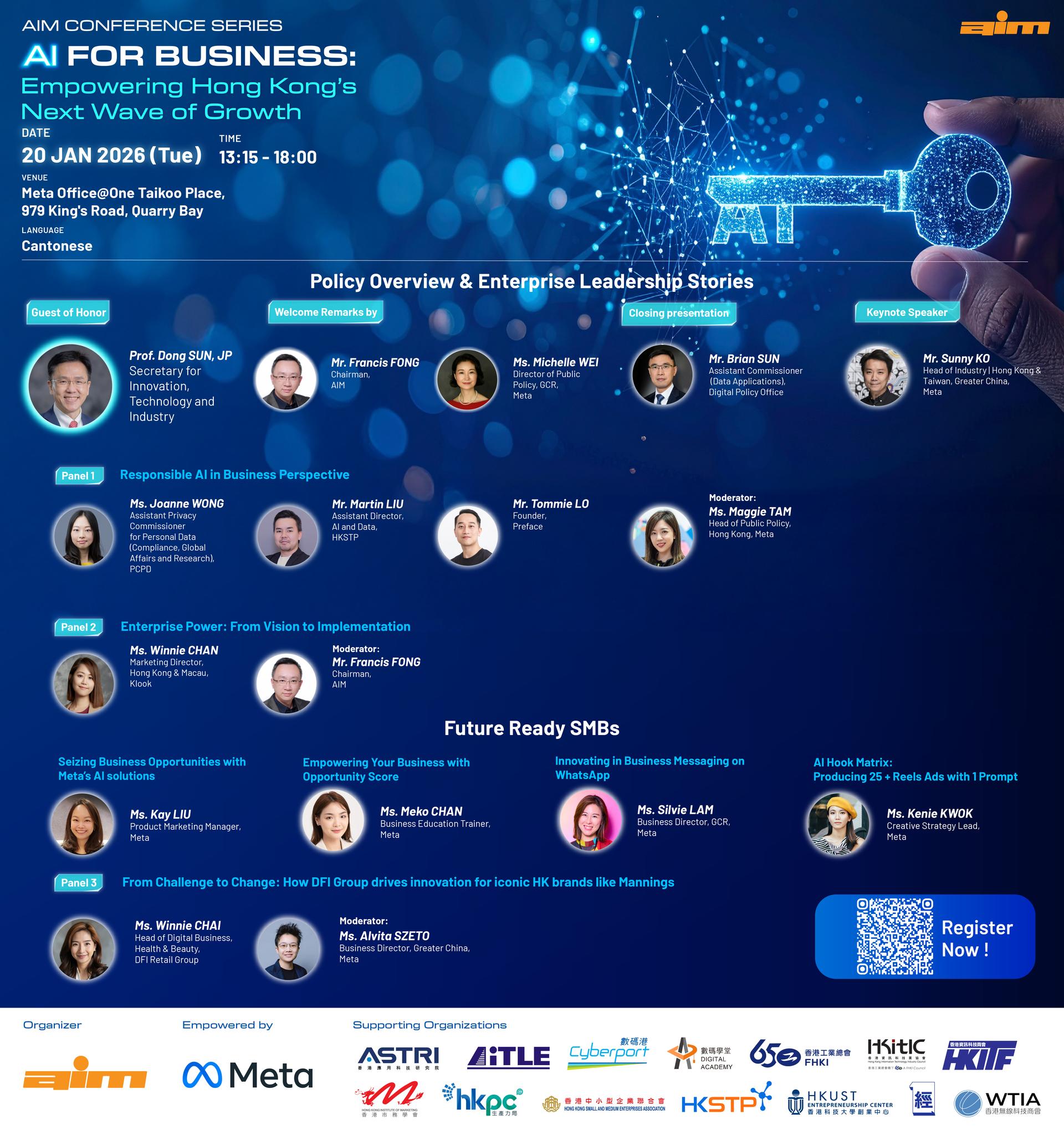 時間:13:15 - 18:00 地點:Meta(鰂魚涌英皇道979號太古坊一座) 主禮嘉賓:創新科技及工業局局長孫東教授, JP 語言:廣東話 查詢:info@hkaim.org | (852) 8106-8622