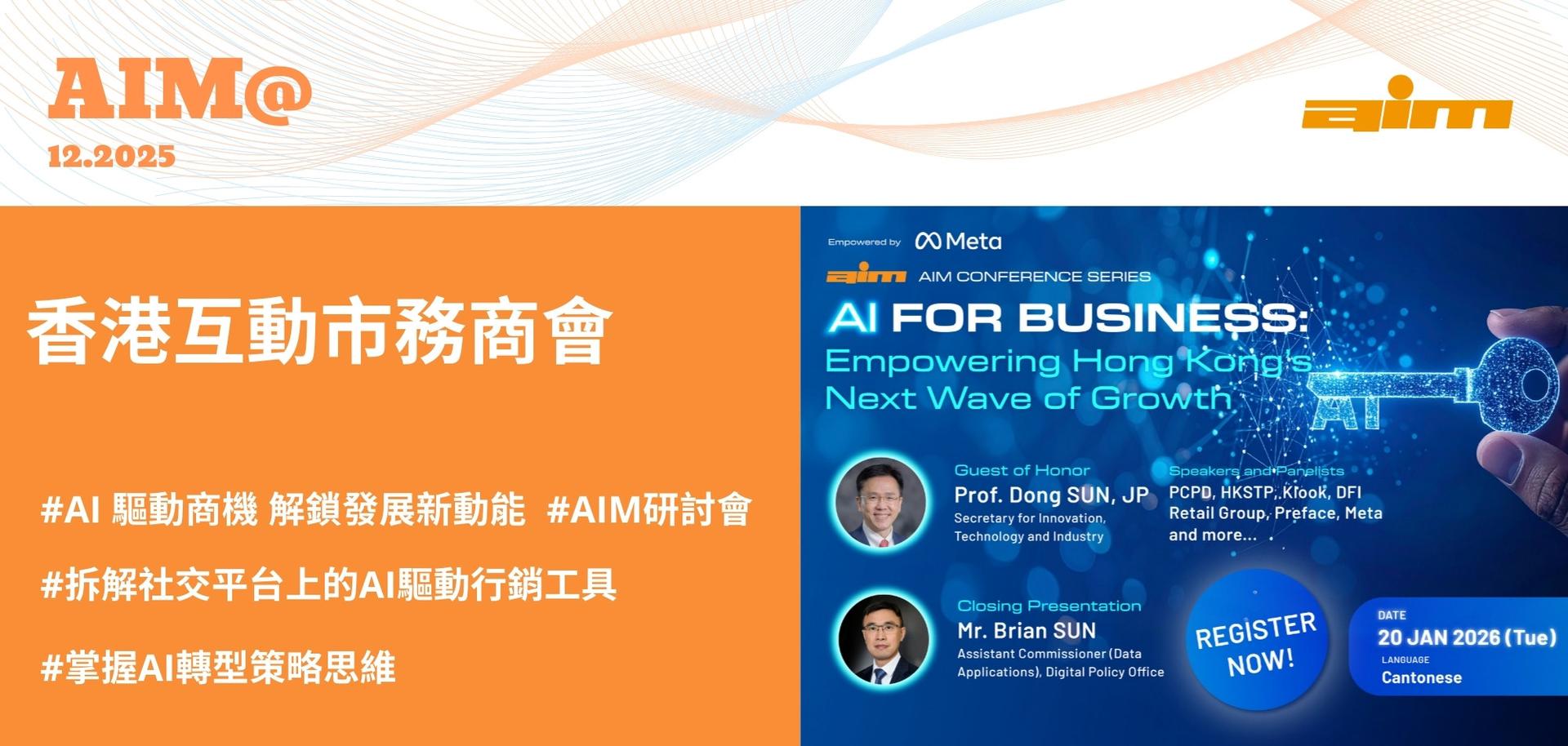 香港正全速邁向人工智能(AI) 賦能經濟發展,如何運用AI提升生產力、推動企業成長、優化行銷及營運效率,是中小企和各行業的致勝關鍵。【AIM研討會—AI 驅動商機 解鎖發展新動能】將於2026年1月20日舉行,是次研討會邀得創新科技及工業局局長孫東教授, JP親臨主禮,並再次匯聚政府高層、各行業翹楚、科技創新及營銷專家為我們探討善用AI在推動業界的可能性。 |